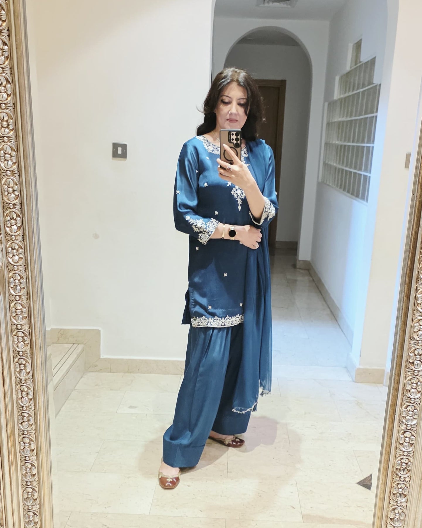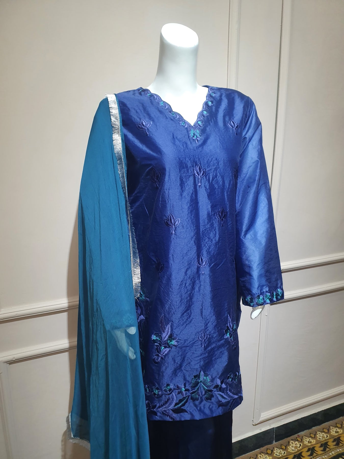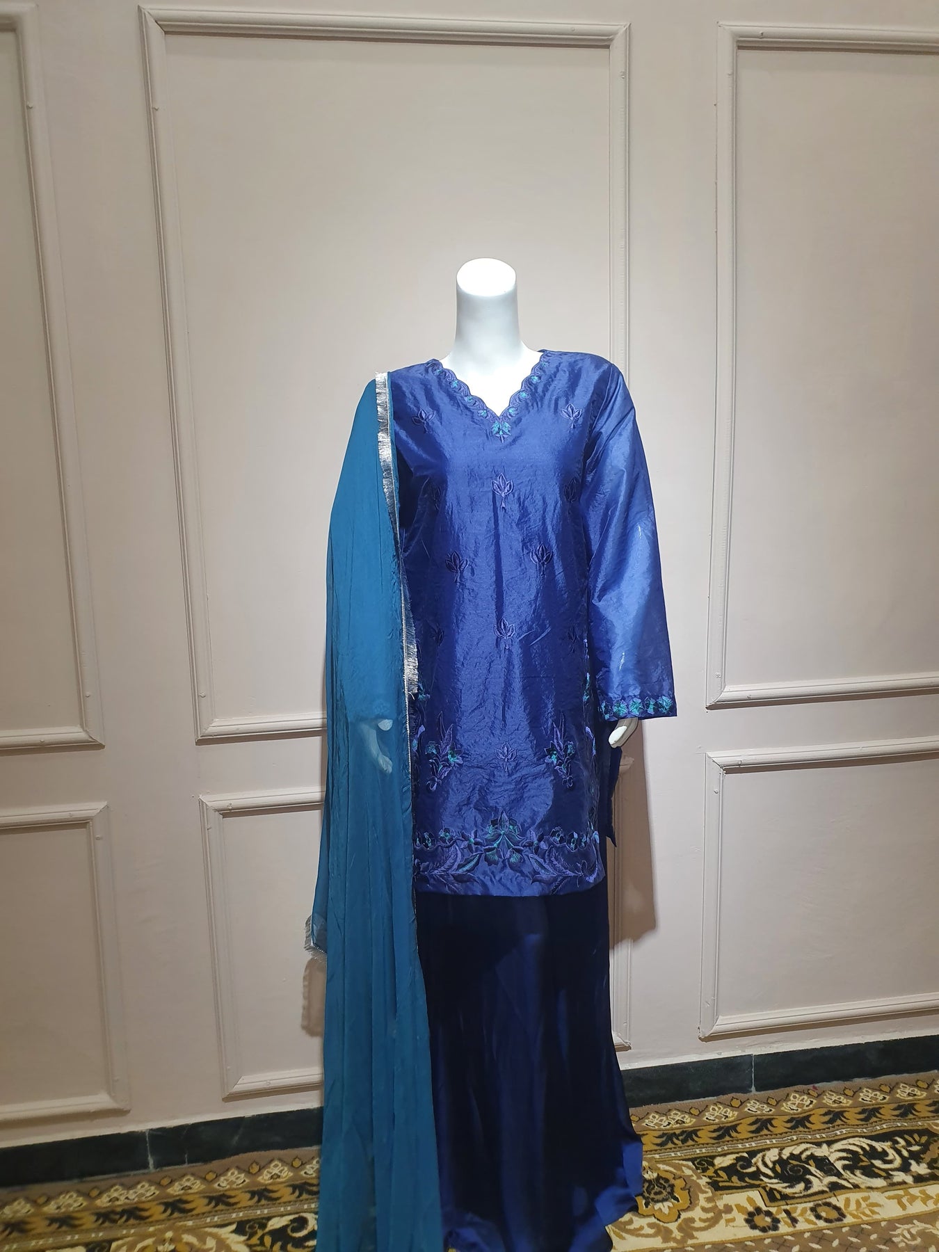 A refined and sophisticated thread work embroidery organza shirt in rich tone of navy blue, paired with wide plazo and chiffon dupatta.