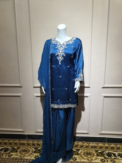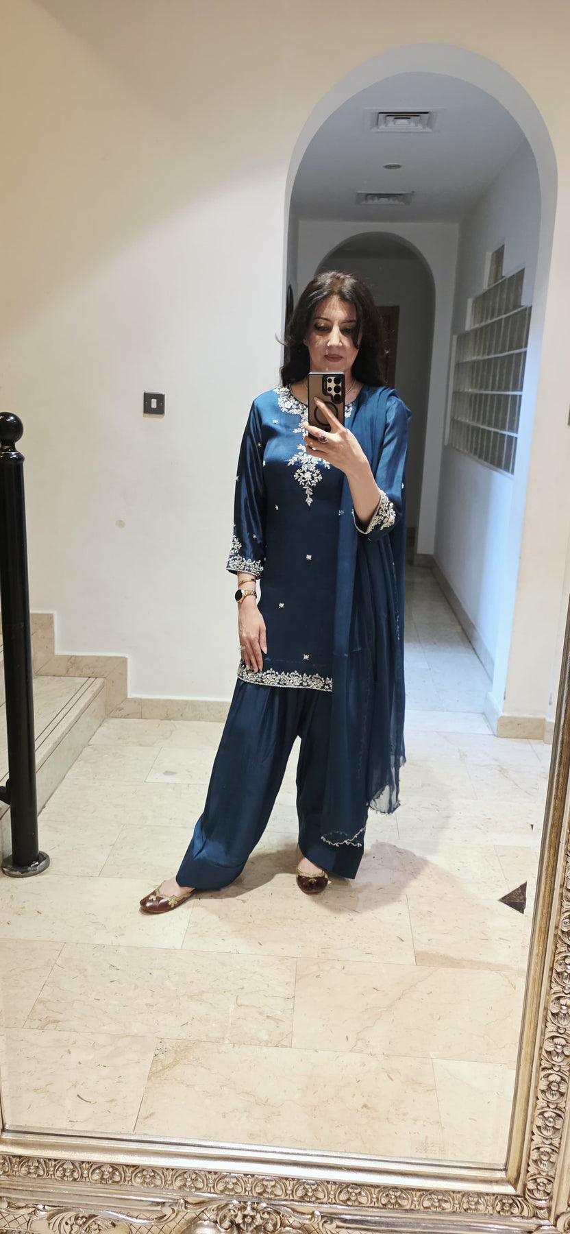 Step into timeless sophistication with our Cobalt Blue Sheesha Silk Formal. Crafted from pure sheesha silk, the shirt is adorned with intricate silver handwork of kora, dabka, sitara, and delicate pearls, creating a stunning contrast against the deep blue base. It is paired with a graceful farshi shalwar and an elegant chiffon dupatta finished with silver edging, making it the perfect ensemble for weddings, formal evenings, and festive occasions.