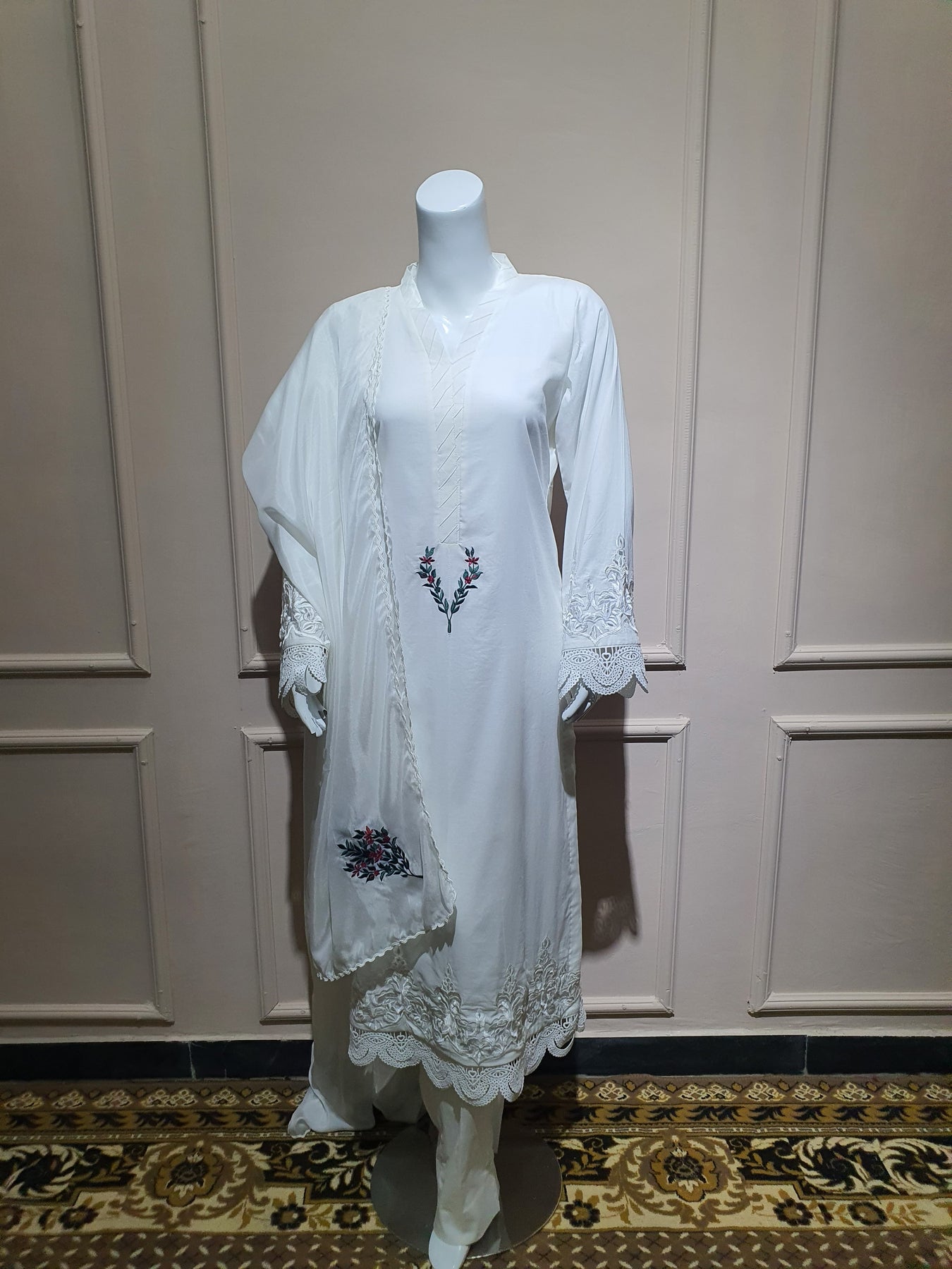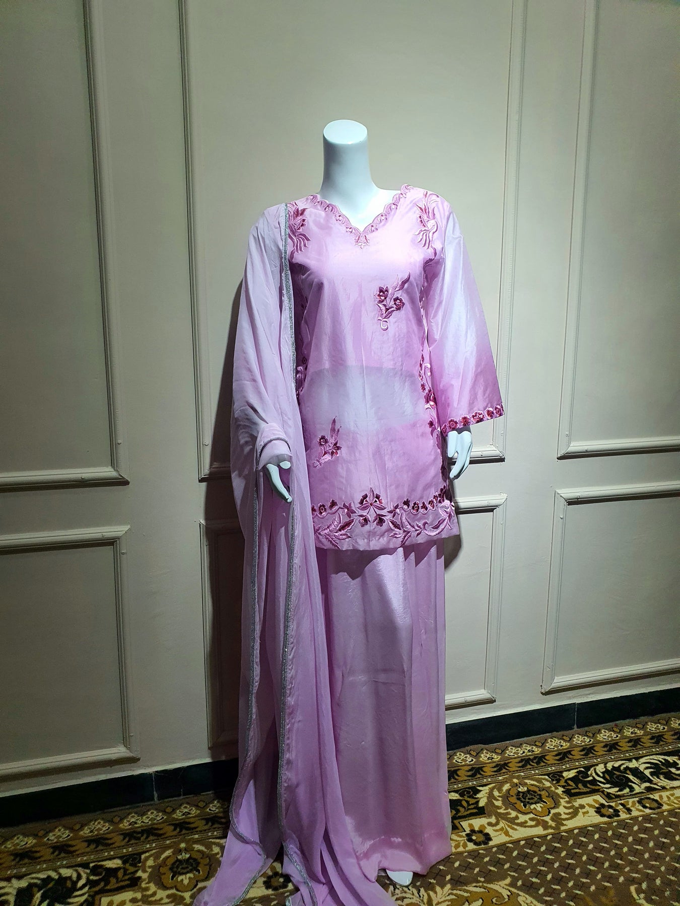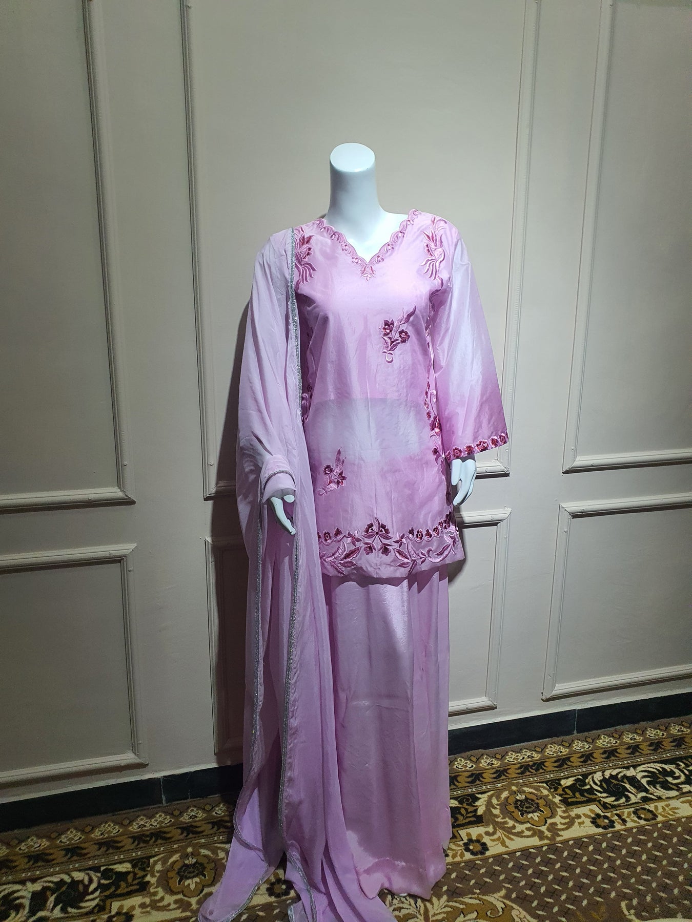 Turn heads with this graceful lilac ensemble featuring delicate embroidery on a soft, flowy fabric. Perfect for festive occasions or casual elegance, this 3-piece set combines comfort with timeless charm.