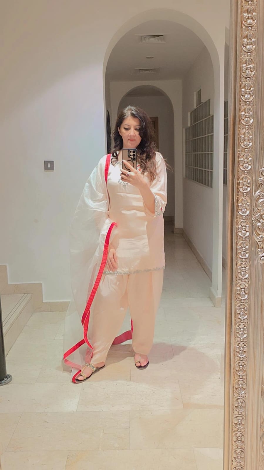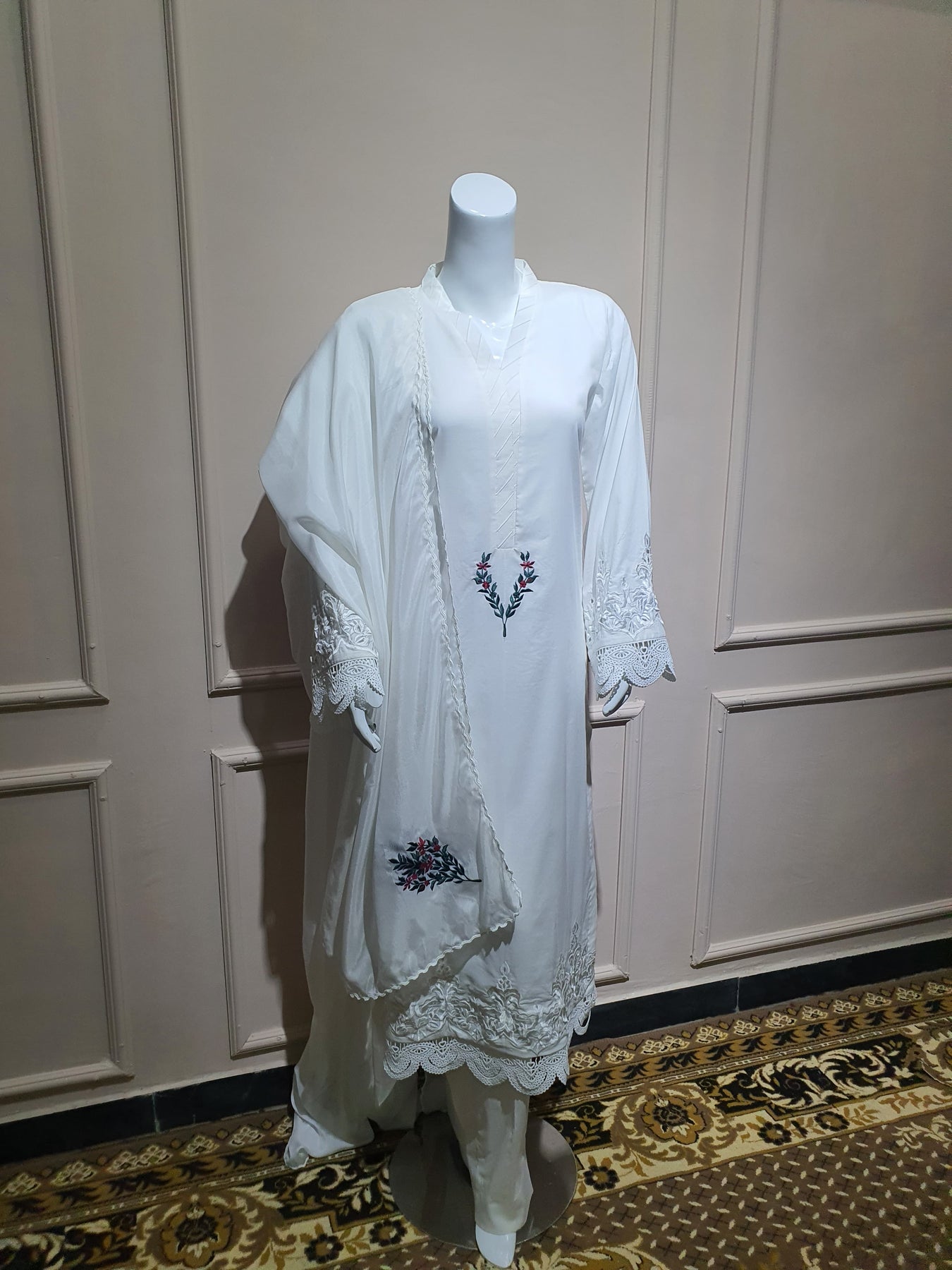 A story of timeless charm, breezy comfort, and unapologetic style — this look defines what summer dreams are made of. 🌿 This dress has threadwork embroidery on daman, sleeves hem and motifs made with rich green and red color, paired with soft silk dupatta, featuring motifs on corners.