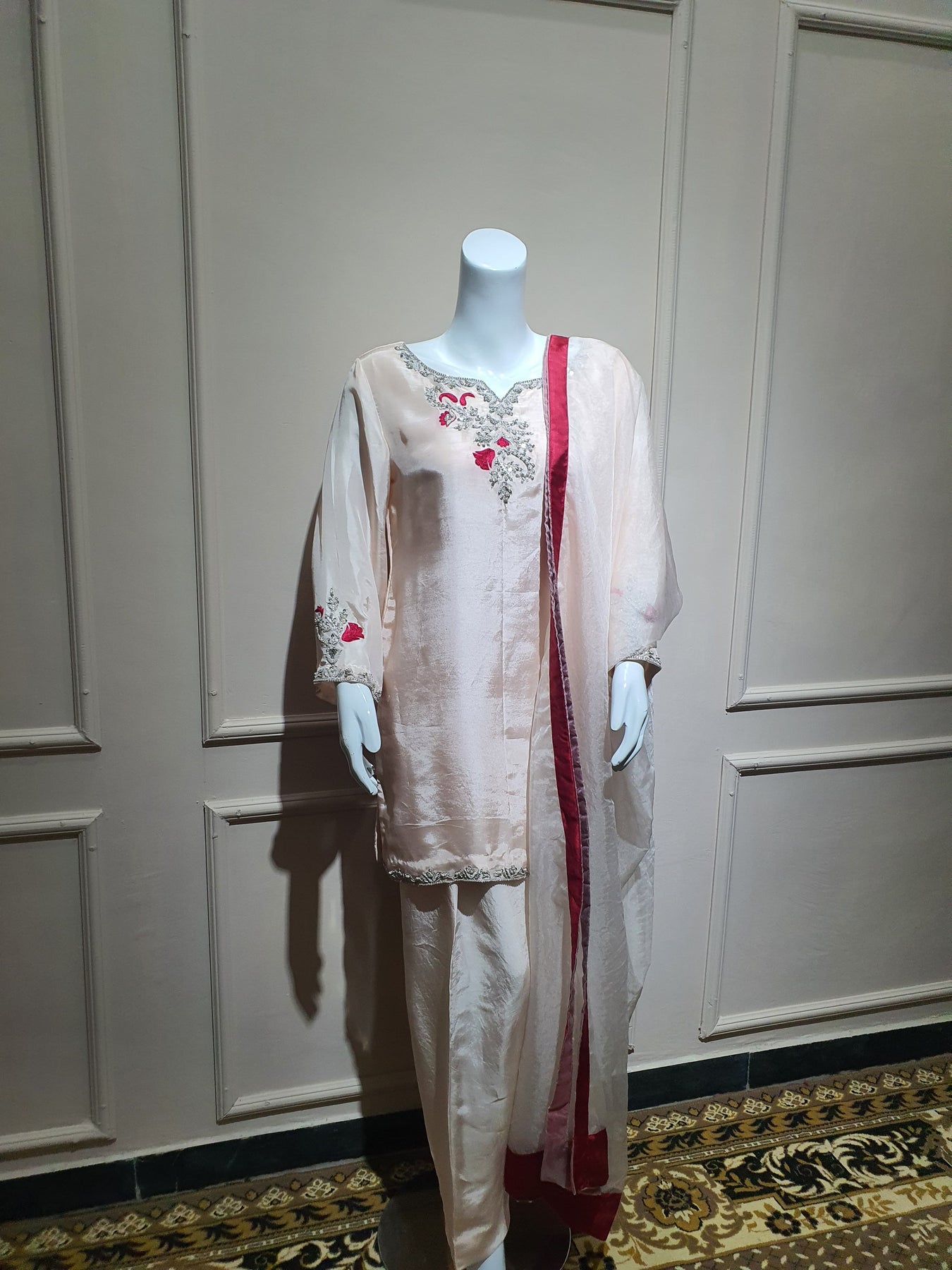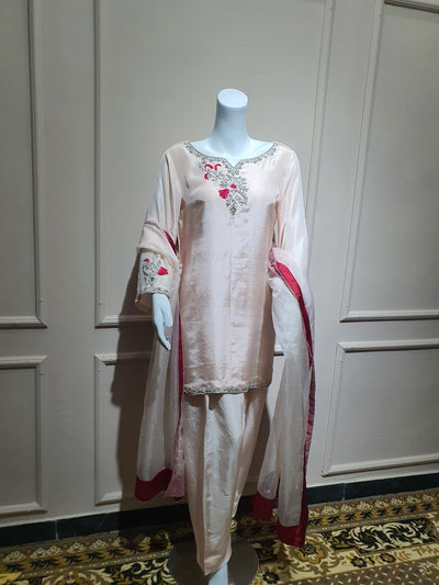 A soft peach hue meets the richness of pure tussel silk , adorned with delicate hand embroidery including dabka, kora and pearls, giving a touch of red resham that speaks of timeless charm. It is paired with old style khari shalwar, matching it with organza dupatta having overlay red color shamoz silk.