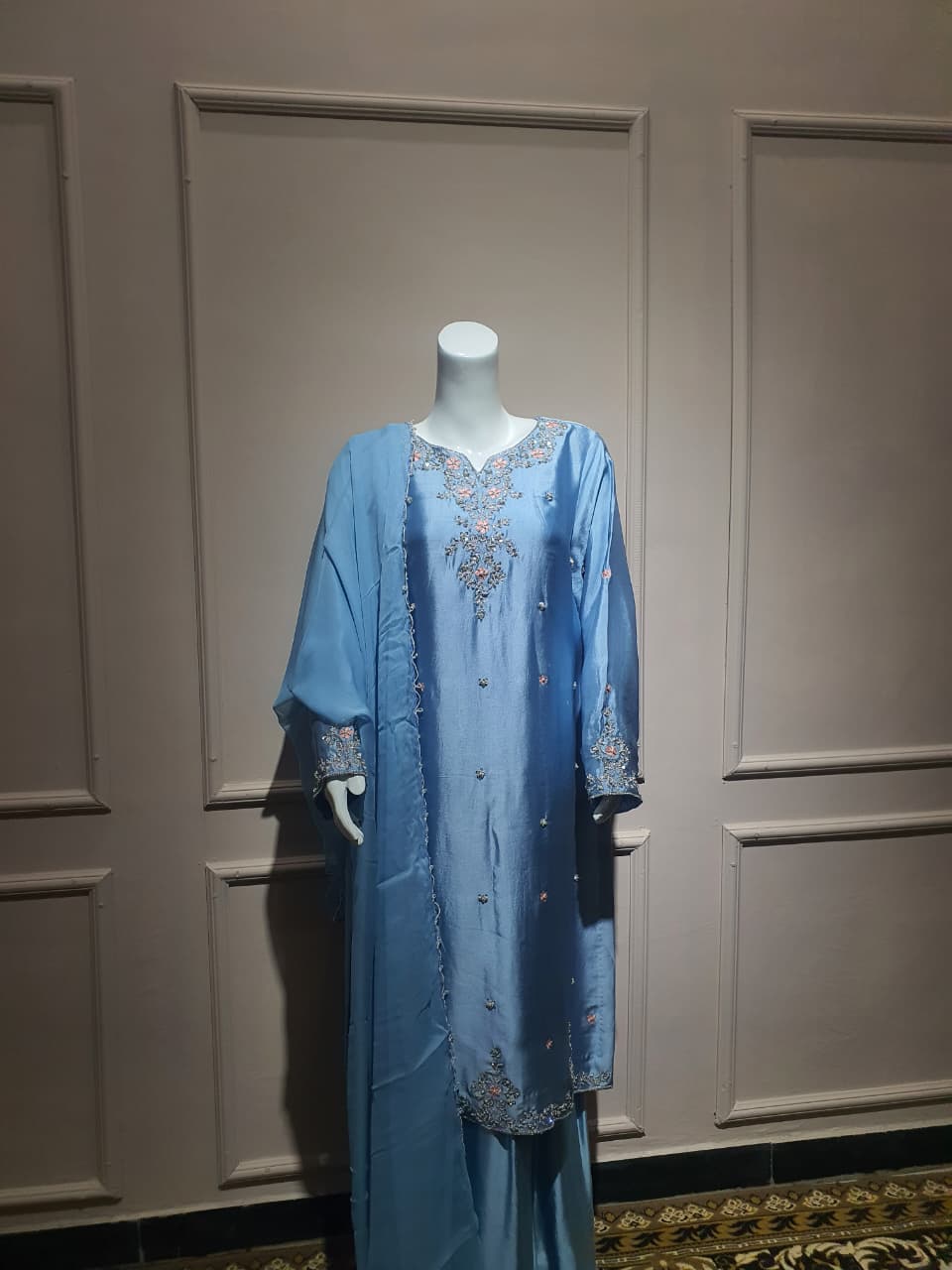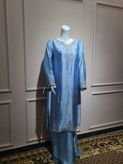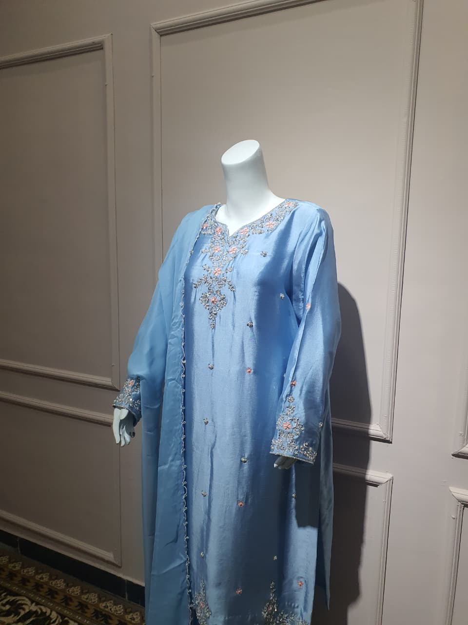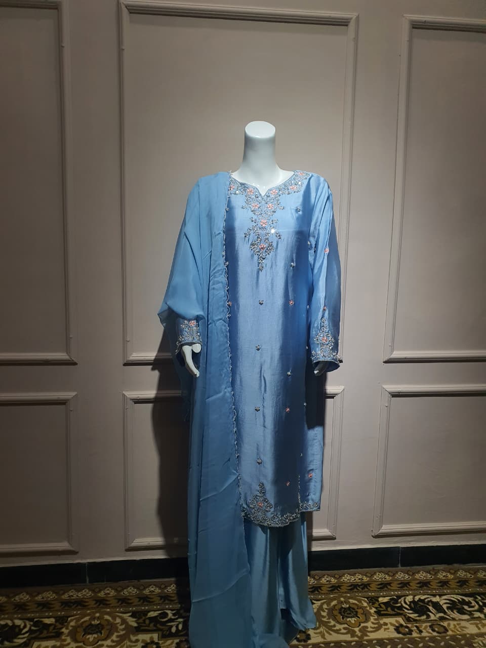 Step into refined luxury with our Sky Blue Sheesha Silk Formal Dress, adorned with exquisite handwork of kora, dabka, pearls, sitara, and pink resham embroidery. The intricate detailing on the neckline, sleeves, and hem brings out timeless craftsmanship, while the plazo pants add a modern, stylish touch. Finished with a chiffon dupatta featuring delicate silver accents, this ensemble is an ideal pick for weddings, festive occasions, and formal gatherings.